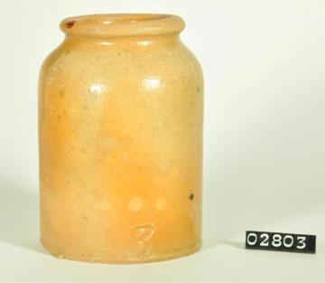 Zylinderförmiges Steinzeuggefäß mit eingezogener Schulter und Hals sowie verdickter, runder Mündung. Standboden plan