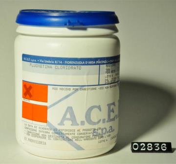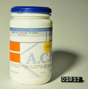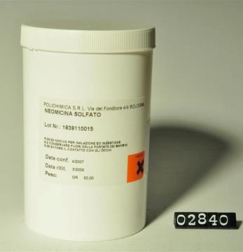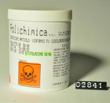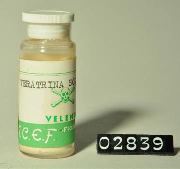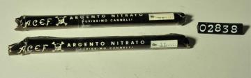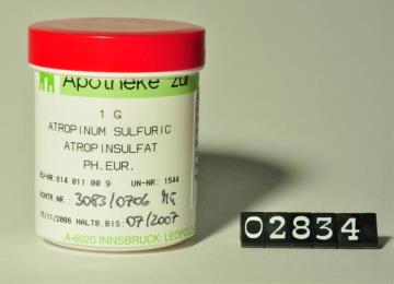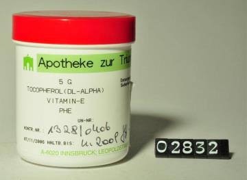 Farblose Glasfiale mit Kunststoffstöpfel in Wachs getaucht und mit schwarzem Papier verpackt. Zusätzlich in zwei Reagenzgläser mit Korkstopfen gegeben. Etikettiert