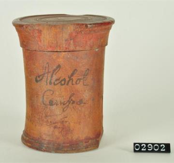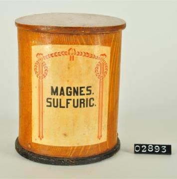 Braune, zylinderförmige Standdose aus maseriertem und lackiertem Hartpapier, leicht vorstehender, dunkelbrauner Holzboden und vorstehender, flacher Steckdeckel aus Holz. Schwarz signiert. Enthielt Magnesiumsulfat, auch Bittersalz genannt.