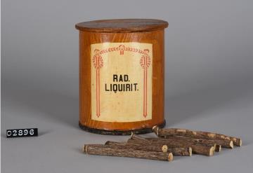 Braune, zylinderförmige Standdose aus maseriertem und lackiertem Hartpapier, leicht vorstehender, dunkelbrauner Holzboden und vorstehender, flacher Steckdeckel aus Holz. Schwarz signiert. Enthält Süßholzwurzel, ganz.