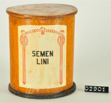 Braune, zylinderförmige Standdose aus maseriertem und lackiertem Hartpapier, leicht vorstehender, dunkelbrauner Holzboden und vorstehender, flacher Steckdeckel aus Holz. Schwarz signiert. Enthielt Leinsamen.