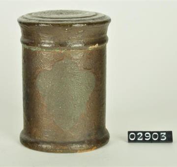 Braune, zylinderförmige Standdose aus maseriertem und lackiertem Hartpapier, leicht vorstehender, dunkelbrauner Holzboden und vorstehender, flacher Steckdeckel aus Holz. Schwarz signiert. Enthielt Natriumborat = Borax.