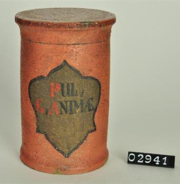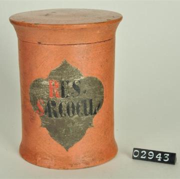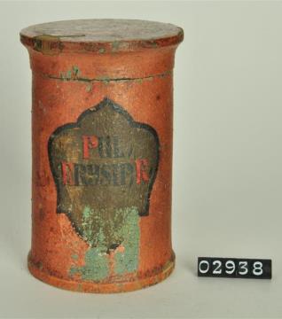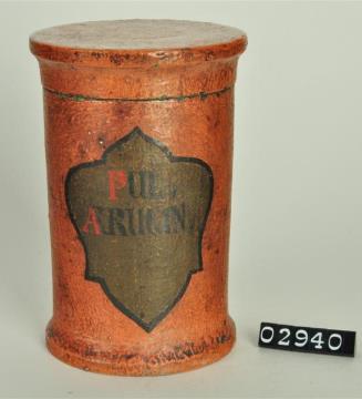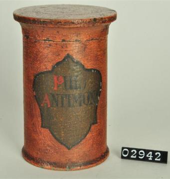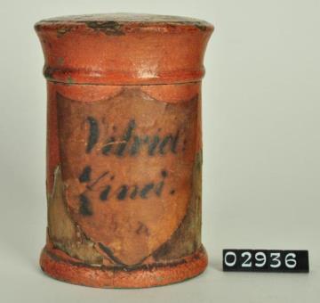 Ziegelrote, zylinderförmige Holzdose (Holzbüchse) mit abgesetztem Standfuß und eingepaßtem, schwach gewölbtem Stülpdeckel mit Wulst und nach außen gebogenem Profil. Auf der Schauseite schildförmiges Papierschild. Schwarz signiert. Enthielt Zinksulfat (Zinkvitriol).