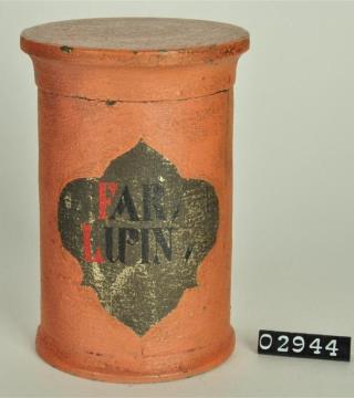 Ziegelrote, zylinderförmige Holzdose (Holzbüchse) mit ausgestelltem Standfuß und eingepaßtem, kaum gewölbtem Stülpdeckel mit nach außen gebogenem Profil. Auf der Schauseite geschwungenes, olivgrünes Beschriftungsfeld mit Resten von Goldfarbe. Rot und schwarz signiert