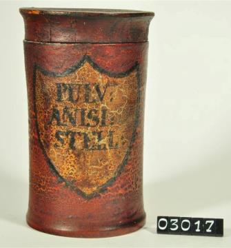 Braune, zylinderförmige Holzdose (Holzbüchse) mit ausgestelltem und abgesetztem Standfuß und eingepaßtem, flachem Stülpdeckel und nach außen gebogenem Profil. Auf der Schauseite schildförmiges und goldfarbenes Beschriftungsfeld mit schwarzem Rand. Schwarz signiert. Enthält Sternanispulver.