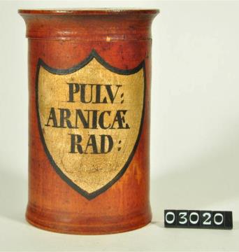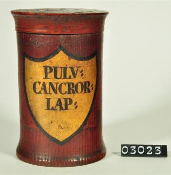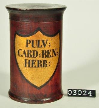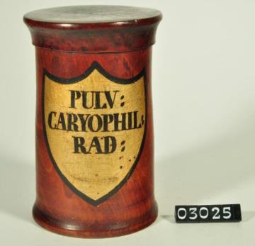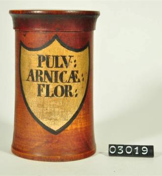 Braune, zylinderförmige Holzdose (Holzbüchse) mit ausgestelltem und abgesetztem Standfuß und eingepaßtem, kaum gewölbtem Stülpdeckel und nach außen gebogenem Profil. Auf der Schauseite schildförmiges und goldfarbenes Beschriftungsfeld mit schwarzem Rand. Schwarz signiert
