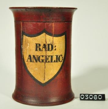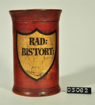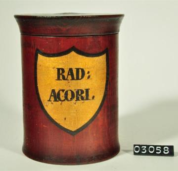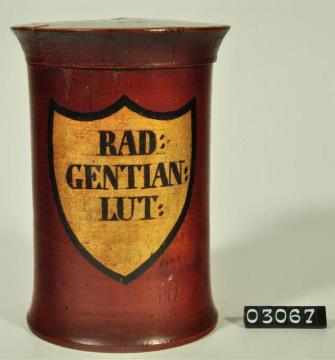 Braune, zylinderförmige Holzdose (Holzbüchse) mit ausgestelltem Standfuß und eingepaßtem, flachem Stülpdeckel und nach außen gebogenem Profil. Auf der Schauseite schildförmiges und goldfarbenes Beschriftungsfeld mit schwarzem Rand. Schwarz signiert