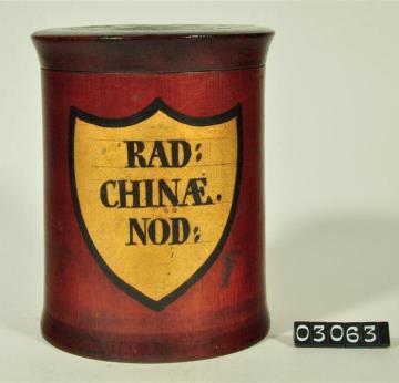 Braune, zylinderförmige Holzdose (Holzbüchse) mit ausgestelltem, abgesetztem Standfuß und eingepaßtem, kaum gewölbtem Stülpdeckel und nach außen gebogenem Profil. Auf der Schauseite schildförmiges und goldfarbenes Beschriftungsfeld mit schwarzem Rand. Schwarz signiert