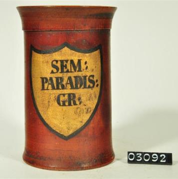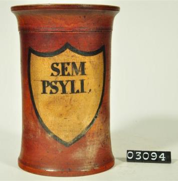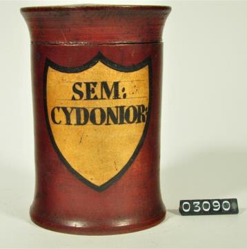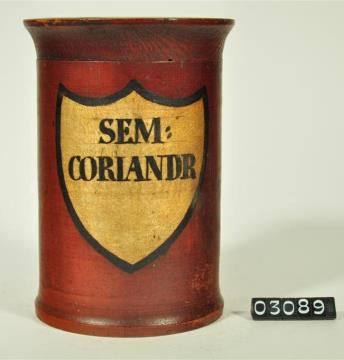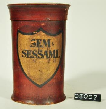 Braune, zylinderförmige Holzdose (Holzbüchse) mit ausgestelltem Standfuß und eingepaßtem, kaum gewölbtem Stülpdeckel und nach außen gebogenem Profil. Auf der Schauseite schildförmiges und goldfarbenes Beschriftungsfeld mit schwarzem Rand. Schwarz signiert. Enthielt Kürbiskernsamen.