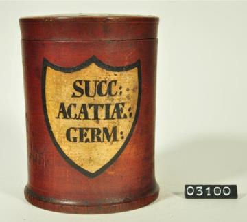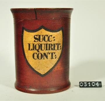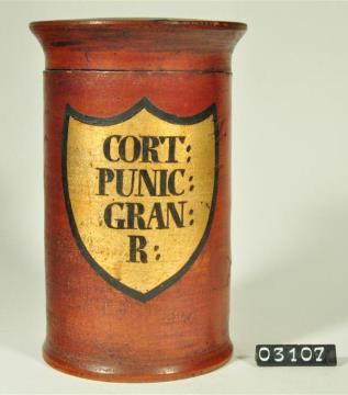 Braune, zylinderförmige Holzdose (Holzbüchse) mit abgesetztem Standfuß und eingepaßtem, kaum gewölbtem Stülpdeckel und nach außen gebogenem Profil. Auf der Schauseite schildförmiges und goldfarbenes Beschriftungsfeld mit schwarzem Rand. Schwarz signiert. Enthielt die Rinde des Granatbaumes, welche als Bandwurmmittel verwendet wurde.