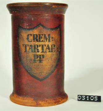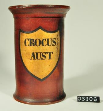 Braune, zylinderförmige Holzdose (Holzbüchse) mit abgesetztem Standfuß und eingepaßtem, flachem Stülpdeckel mit nach außen gebogenem Profil; auf der Deckel- Innenseite die Jahreszahl 1686. Schauseite mit schildförmigem und goldfarbenem Beschriftungsfeld mit schwarzem Rand. Schwarz signiert mit Crocus austriacus. Innenseite Deckel: rechteckiges, gezähntes, weißes Etikett mit mit schwarzem Doppelrand. Handschriftlich ergänzt: Crocus pulv. 1g K(reuzer) 30. Darunter handbeschriebenes Schild "Croc austr: pulv 1.0 26x". Enthält Safran aus der Wachau.