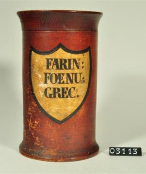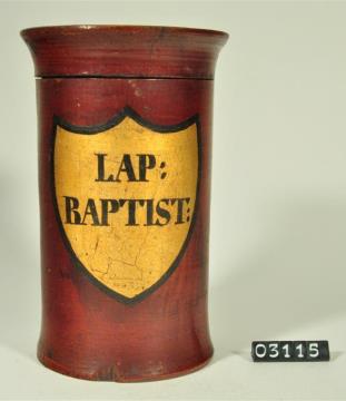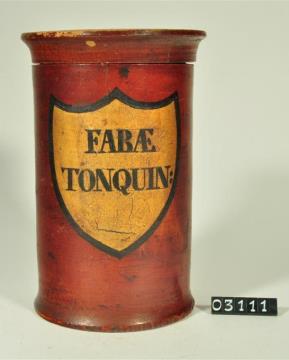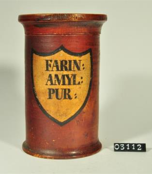 Braune, zylinderförmige Holzdose (Holzbüchse) mit abgesetztem Standfuß und eingepaßtem, flachem Stülpdeckel und nach außen gebogenem Profil. Auf der Schauseite schildförmiges und goldfarbenes Beschriftungsfeld mit schwarzem Rand. Schwarz signiert