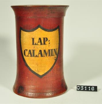 Braune, zylinderförmige Holzdose (Holzbüchse) mit ausgestelltem Standfuß und eingepaßtem, flachem Stülpdeckel und nach außen gebogenem Profil. Auf der Schauseite schildförmiges und goldfarbenes Beschriftungsfeld mit schwarzem Rand. Schwarz signiert. Enthielt Galmeistein.