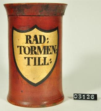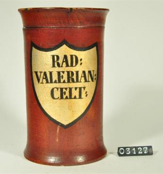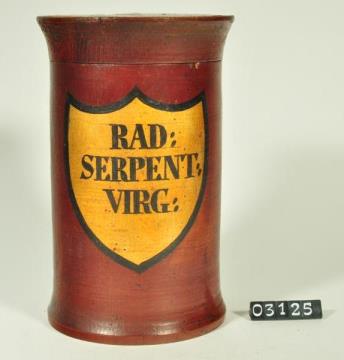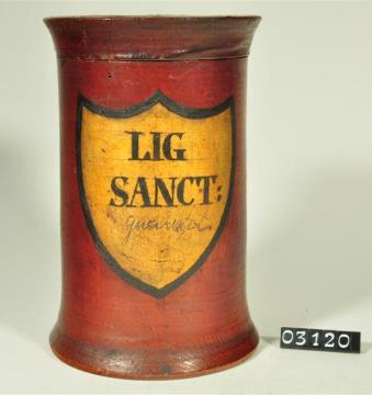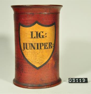 Braune, zylinderförmige Holzdose (Holzbüchse) mit ausgestelltem Standfuß und eingepaßtem, flachem Stülpdeckel und nach außen gebogenem Profil. Auf der Schauseite schildförmiges und goldfarbenes Beschriftungsfeld mit schwarzem Rand. Schwarz signiert