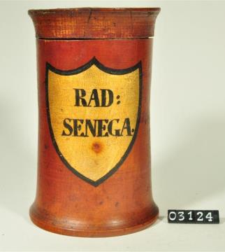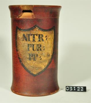 Braune, zylinderförmige Holzdose (Holzbüchse) mit ausgestelltem Standfuß und eingepaßtem, kaum gewölbtem Stülpdeckel und nach außen gebogenem Profil. Auf der Schauseite schildförmiges und goldfarbenes Beschriftungsfeld mit schwarzem Rand. Schwarz signiert