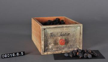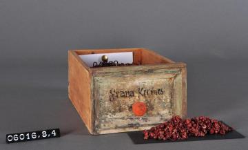 Schublade aus Nadelholz mit rotem Knauf und profilierter Vorderseite, unregelmäßigem Grundriss, individuell an den Schrank angepasst. Gezinkte Verbindungen (Schwalbenschwanzverbindung). Boden angeleimt. Vorderfront grün, mit schwarzer Signatur händisch beschriftet. Enthält Schlehenfrüchte als Ganzdroge.