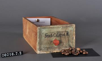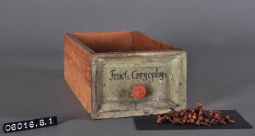 Schublade aus Nadelholz mit rotem Knauf und profilierter Vorderseite, unregelmäßiger Grundriss, individuell an den Schrank angepasst. Gezinkte Verbindungen (Schwalbenschwanzverbindung). Boden angeleimt. Vorderfront grün, mit schwarzer Signatur händisch beschriftet. Innen Etikett der Firma Petzoldt & Süß aus Wien. Enthält Mutternelken als Ganzdroge.