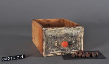 Schublade aus Nadelholz mit rotem Knauf und profilierter Vorderseite, unregelmäßiger Grundriss, individuell an den Schrank angepasst. Gezinkte Verbindungen (Schwalbenschwanzverbindung). Boden angeleimt. Vorderfront grün, mit schwarzer Signatur händisch beschriftet. Enthält Muskatnüsse als Ganzdroge (30 Stück) und eine leere Tüte mit Aufschrift "Sindacato agricolo industriale Trento: Noci moscate 100g".