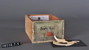 Schublade aus Nadelholz mit rotem Knauf und profilierter Vorderseite, unregelmäßiger Grundriss, individuell an den Schrank angepasst. Gezinkte Verbindungen (Schwalbenschwanzverbindung). Boden angeleimt. Vorderfront grün, mit schwarzer Signatur händisch beschriftet. Enthält Eberzähne als Ganzdroge sowie kleine Bruchstücke.