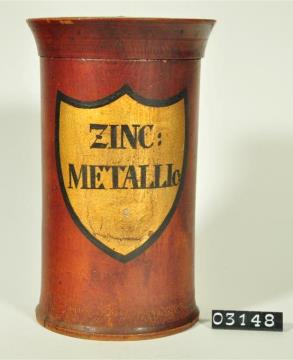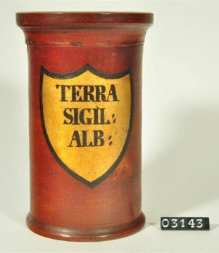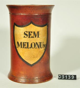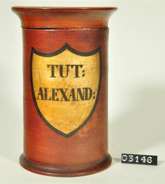 Braune, zylinderförmige Holzdose (Holzbüchse) mit abgesetztem Standfuß und eingepaßtem, flachem Stülpdeckel und nach außen gebogenem Profil. Auf der Schauseite schildförmiges und goldfarbenes Beschriftungsfeld mit schwarzem Rand. Schwarz signiert
