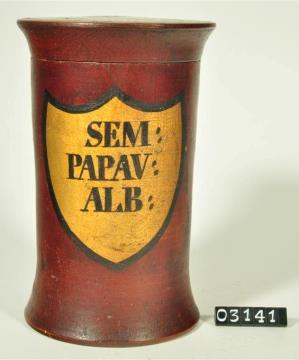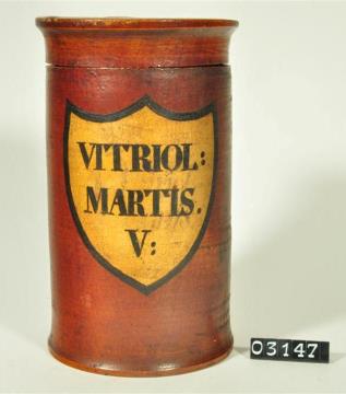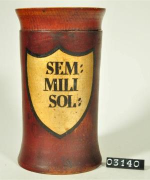 Braune, zylinderförmige Holzdose (Holzbüchse) mit ausgestelltem Standfuß und eingepaßtem, flachem Stülpdeckel und nach außen gebogenem Profil. Auf der Schauseite schildförmiges und goldfarbenes Beschriftungsfeld mit schwarzem Rand. Schwarz signiert. Innen mundgeblasene leere, kleine grünliche Glasflasche mit flacher Schulter, ausgebogenem Mündungsrand und hochgestochenem Boden; Korkstopfen.