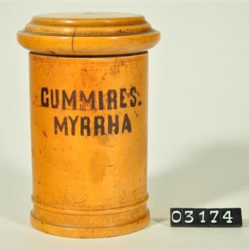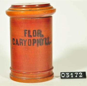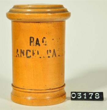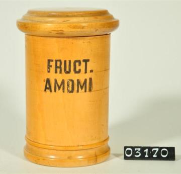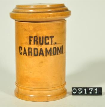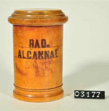 Hellbraune, zylinderförmige Holzdose (Holzbüchse) mit abgesetztem Standfuß bestehend aus Halbrundstab, Kehlung und geradem Abschluss. Flacher Stülpdeckel mit gerundetem Deckelrand und darüber zwei Kehlungen. Schwarz signiert. Enthält Arnikawurzel geschnitten.