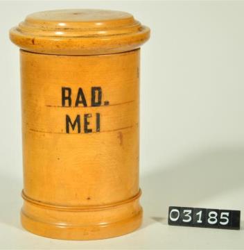 Hellbraune, zylinderförmige Holzdose (Holzbüchse) mit abgesetztem Standfuß bestehend aus Halbrundstab, Kehlung und geradem Abschluss. Flacher Stülpdeckel mit gerundetem Deckelrand und darüber zwei Kehlungen. Schwarz signiert