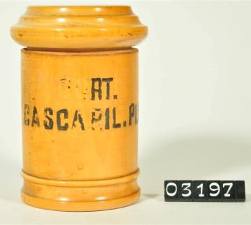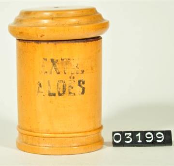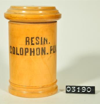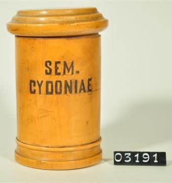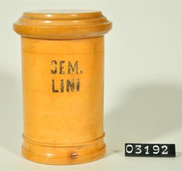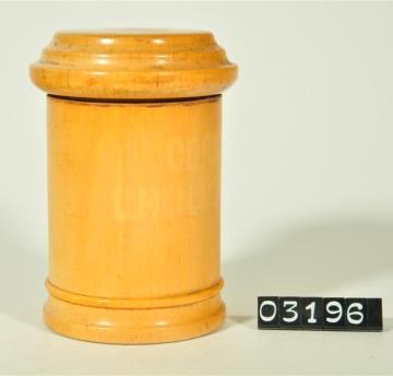 Hellbraune, zylinderförmige Holzdose (Holzbüchse) mit abgesetztem Standfuß bestehend aus Halbrundstab, Kehlung und geradem Abschluss. Flacher Stülpdeckel mit gerundetem Deckelrand und darüber zwei Kehlungen. Schwarz signiert