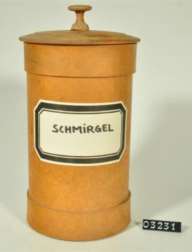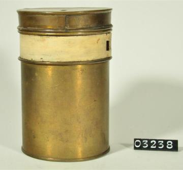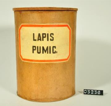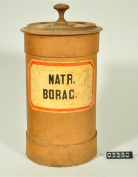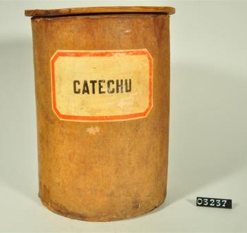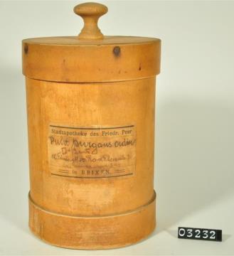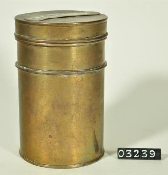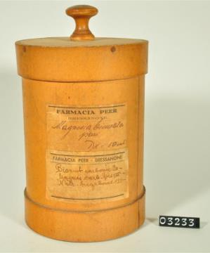 Hellbraune, zylinderförmige Dose aus Hartpapier, mit unterem Reifen und Stülpdeckel mit zentralem Knauf. Etikettiert