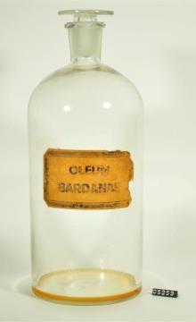 Farblose, zylindrische Enghalsflasche mit Schliffstopfen für Klettenwurzelöl. Mit Signierapparat bedrucktes Papierschild, achteckig, mit schwarzem Doppelrand und schwarzer Schrift auf ehemals weißem Grund. Mit Schilderlack überzogen. Enthält reste von Klettenwurzelöl.