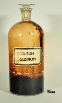 Farblose, zylindrische Enghalsflasche mit Schliffstopfen für Wacholderholzöl. Mit Signierapparat bedrucktes Papierschild, achteckig, mit schwarzem Doppelrand und schwarzer Schrift auf ehemals weißem Grund. Mit Schilderlack überzogen.