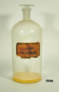 Farblose, zylindrische Enghalsflasche mit Schliffstopfen. Mit Signierapparat bedrucktes Papierschild, achteckig, mit schwarzem Doppelrand und schwarzer Schrift auf ehemals weißem Grund. Mit Schilderlack überzogen.