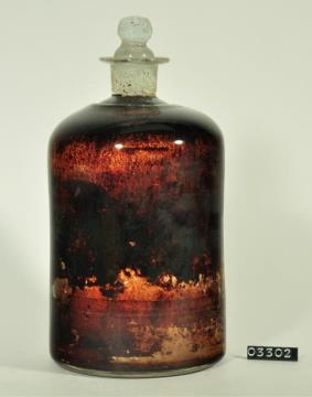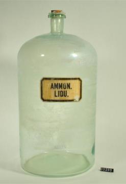 Zylinderförmige, farblose Glasflasche. Innen weiß beschlagen. Manuell aufgesetzter Hals. Wand leicht eingedrückt. Mündungsrand mit umgelegtem Glasfaden. Mit Kork verschlossen. Nach oben gewölbter Boden. Mit Signierapparat bedrucktes und mit Schilderlack überzogenes Papierschild, achteckig, mit schwarzem Doppelrand und schwarzer Schrift auf weißem Grund. Enthielt Salmiakgeist (Ammoniumhydroxid).