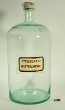 Zylinderförmige, farblose Glasflasche mit Lufteinschlüssen. Manuell aufgesetzter Hals. Wand leicht eingedrückt. Mündungsrand mit umgelegtem Glasfaden. Mit Kork verschlossen. Nach oben gewölbter Boden. Auf der Schulter aufgeschmolzene Glasmarke mit Volumenangabe in österreichischem Maß. Von Elisabeth Fehrenbach-Peer mit Druckbuchstaben beschriftetes und mit Klarsichtfolie überzogenes Papierschild, achteckig, mit schwarzem Doppelrand und schwarzer Schrift auf weißem Grund. Enthielt den gelben Hustensaft. Wurde bis ca 2005 hergestellt.