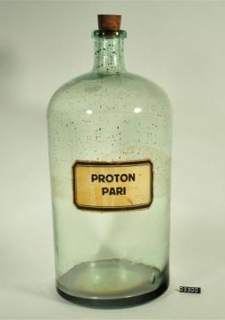 Zylinderförmige, grünstichige Glasflasche mit Lufteinschlüssen.Mündungsrand mit umgelegtem Glasfaden. Mit Kork verschlossen. Nach oben gewölbter Boden. Auf der Schulter aufgeschmolzene Glasmarke mit Volumenangabe in Liter. Mit Signierapparat bedrucktes Papierschild, achteckig, mit schwarzem Doppelrand und schwarzer Schrift auf ehemals weißem Grund. Mit Schilderlack überzogen. Enthielt Protonicium, einen Kalk-Eisensirup.