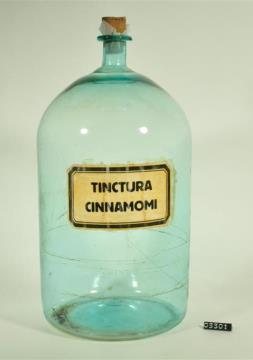 Blaugrüne, zylinderförmige, dünne, mundgeblasene Glasflasche. Manuell aufgesetzter Hals, Mündungsrand mit umgelegtem Glasfaden. Steile Schulter. Boden hochgestochen mit Hefteisenabriß. Mit Signierapparat bedrucktes Papierschild, achteckig, mit schwarzem Doppelrand und schwarzer Schrift auf ehemals weißem Grund. Mit Schilderlack überzogen. Enthielt Zimttinktur.