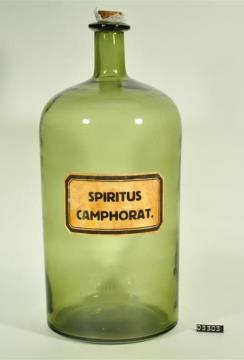 Zylinderförmige, grüne Glasflasche mit Lufteinschlüssen. Maschinell hergestellt, manuell aufgesetzter Hals mit nachgearbeitetem Mündungsrand. Mündungsrand mit umgelegtem Glasfaden. Mit Kork verschlossen. Nach oben gewölbter Boden. Mit Signierapparat bedrucktes Papierschild, achteckig, mit schwarzem Doppelrand und schwarzer Schrift auf ehemals weißem Grund. Mit Schilderlack überzogen. Enthielt Kampferspiritus.
