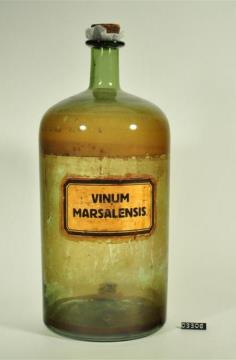 Zylinderförmige, grüne Glasflasche mit Lufteinschlüssen. Maschinell hergestellt, manuell aufgesetzter Hals mit nachgearbeitetem Mündungsrand. Mündungsrand mit umgelegtem Glasfaden. Mit Kork verschlossen. Nach oben gewölbter Boden. Mit Signierapparat bedrucktes Papierschild, achteckig, mit schwarzem Doppelrand und schwarzer Schrift auf ehemals weißem Grund. Mit Schilderlack überzogen. Enthielt süßen Marsalawein.