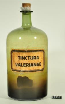 Zylinderförmige, grüne Glasflasche. Maschinell hergestellt, manuell aufgesetzter Hals mit nachgearbeitetem Mündungsrand. Mündungsrand mit umgelegtem Glasfaden. Mit Kork verschlossen. Nach oben gewölbter Boden. Mit Signierapparat bedrucktes Papierschild, achteckig, mit schwarzem Doppelrand und schwarzer Schrift auf ehemals weißem Grund. Mit Schilderlack überzogen. Rückseite unleserliches Schild. Enthielt Baldriantinktur.