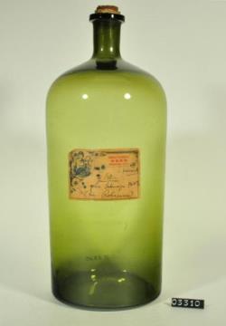 Zylinderförmige, grüne Glasflasche. Maschinell hergestellt, manuell aufgesetzter Hals mit nachgearbeitetem Mündungsrand. Mündungsrand mit umgelegtem Glasfaden. Mit Kork verschlossen. Nach oben gewölbter Boden. Mit Signierapparat bedrucktes Papierschild, achteckig, mit schwarzem Doppelrand und schwarzer Schrift auf ehemals weißem Grund. Mit Schilderlack überzogen. Rückseite Tara mit Nagellack vermerkt. Enthielt Kamilltentinktur.
