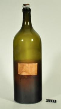Zylinderförmige, grüne Glasflasche mit Lufteinschlüssen. Flachere Schulter. Maschinell hergestellt, manuell aufgesetzter Hals mit nachgearbeitetem Mündungsrand. Mündungsrand mit umgelegtem Glasfaden. Mit Kork verschlossen. Nach oben gewölbter Boden. Mit Signierapparat bedrucktes Papierschild, achteckig, mit schwarzem Doppelrand und schwarzer Schrift auf ehemals weißem Grund. Mit Schilderlack überzogen. Enthielt Kondurangowein.
