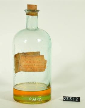 Farblose, industriell hergestellte Glasflasche mit seitlicher Naht. Manuell nachbearbeiteter ausladender Mündungsrand. Nach oben gewölbter Boden mit Prägung (500). Signiert. Originaletikett der Firma G. und R. Fritz Petzold & Süß, Wien. Rückseite Schild, beschrieben von Ignaz Peer II am 19. September 1942. Enthält Anisol.