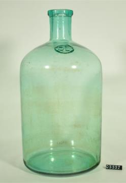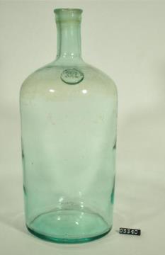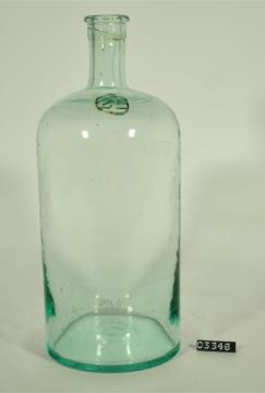 Zylinderförmige, grünstichige Glasflasche mit mit leicht gewellter Oberfläche und vielen kleinen Lufteinschlüssen. Manuell aufgesetzter Hals mit nachgearbeitetem Mündungsrand. Mündung geschliffen. Schliffstopfen fehlt. Nach oben gewölbter Boden mit nicht planem Standring. Auf der Schulter aufgeschmolzene Glasmarke, Durchmesser 30 mm, mit Volumenangabe in Liter.