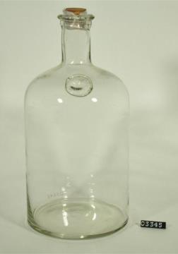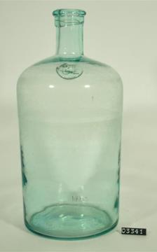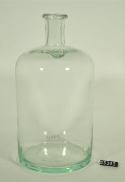 Zylinderförmige, farblose, mundgeblasene Glasflasche mit mit leicht gewellter Oberfläche. Manuell aufgesetzter Hals mit nachgearbeitetem Mündungsrand mit umgelegtem Glasfaden. Nach oben gewölbter Boden mit großem Hefteisenabriss und fast planem Standring. Auf der Schulter aufgeschmolzene Glasmarke, Durchmesser 24 mm, mit eingravierter Volumenangabe in Liter. Innenwand milchige Substanzreste.
