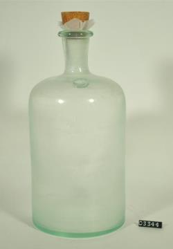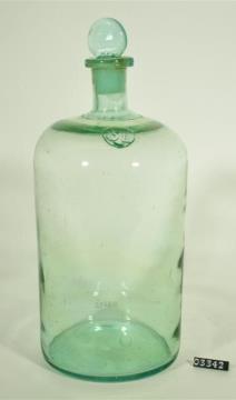Zylinderförmige, grünstichige Glasflasche mit mit leicht gewellter Oberfläche und vielen kleinen Lufteinschlüssen. Manuell aufgesetzter Hals mit nachgearbeitetem Mündungsrand mit umgelegtem Glasfaden. Mündung geschliffen. Schliffstopfen mit flachem Knauf. Nach oben gewölbter Boden mit planem Standring. Auf der Schulter aufgeschmolzene Glasmarke, Durchmesser 30 mm, mit Volumenangabe in Liter.