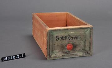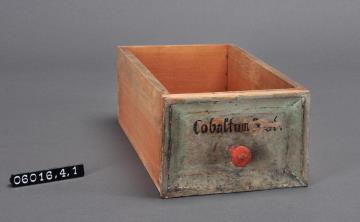 Schublade aus Nadelholz mit rotem Knauf und profilierter Vorderseite, unregelmäßigem Grundriss, individuell an den Schrank angepasst. Gezinkte Verbindungen (Schwalbenschwanzverbindung). Boden angeleimt. Vorderfront grün, mit schwarzer Signatur händisch beschriftet. Enthielt das große Stück Scherbenkobalt (Fliegenstein), das sich heute im Materia-medica-Schrank der Dauerausstellung befindet.