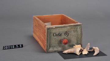 Schublade aus Nadelholz mit rotem Knauf und profilierter Vorderseite, unregelmäßigem Grundriss, individuell an den Schrank angepasst. Gezinkte Verbindungen (Schwalbenschwanzverbindung). Boden angeleimt. Vorderfront grün, mit schwarzer Signatur händisch beschriftet. Enthält Krebsscheren als Ganzdroge.
