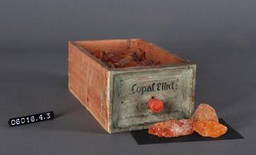 Schublade aus Nadelholz mit rotem Knauf und profilierter Vorderseite, unregelmäßigem Grundriss, individuell an den Schrank angepasst. Gezinkte Verbindungen (Schwalbenschwanzverbindung). Boden angeleimt. Vorderfront grün, mit schwarzer Signatur händisch beschriftet. Enthält Kopal, zum Teil auch in großen Stücken.