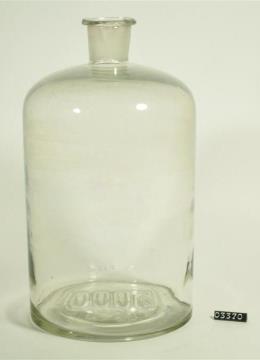 Zylinderförmige, farblose Glasflasche. Wellige Oberfläche. Manuell aufgesetzter, innen geschliffener Hals. Glasstopfen fehlt. Leicht hochgewölbter Boden mit Prägung (5000). Fast planer Standring.