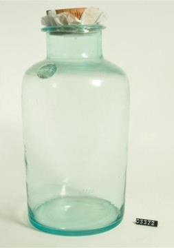 Zylinderförmige, farblose Glasflasche. Wellige Oberfläche, Innenfläche trüb durch Ablagerungen. Manuell aufgesetzter, innen geschliffener Hals. Massiver Glasstopfen mit flachem Knauf. Leicht hochgewölbter Boden mit ausgeschliffenem Hefteisenabriss. Planer Standring.